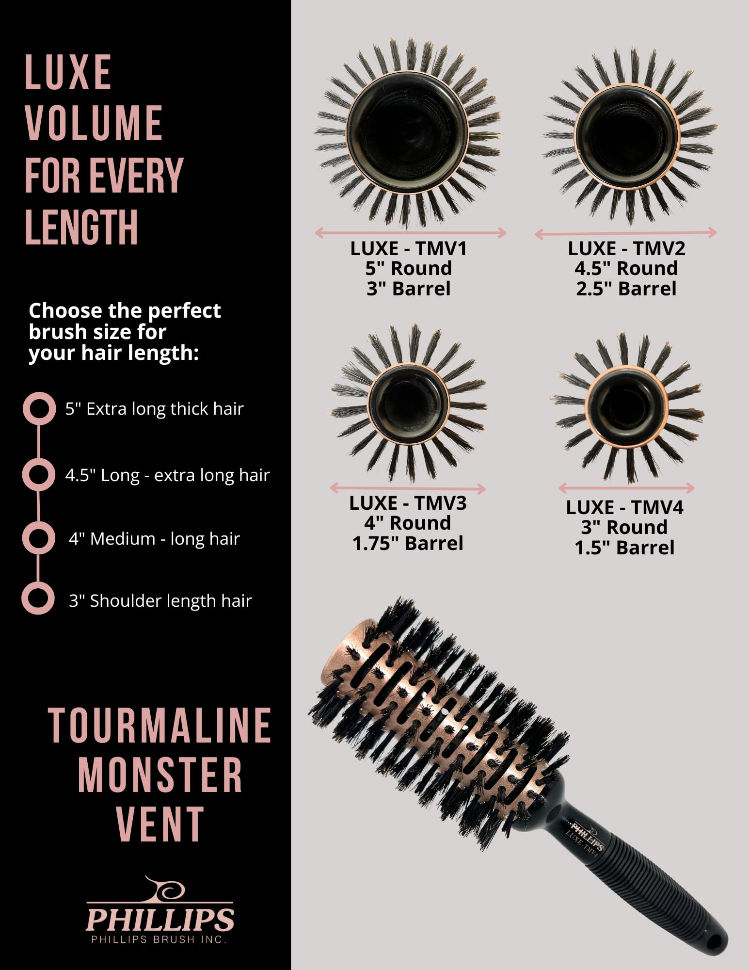 Phillips Brush Luxe Tourmaline Monster Vent 1 Professional Hair Brush (5” Diameter Barrel) - Vented Hairbrush Nylon Reinforced Boar Hair Bristles, Sleek Rose Gold & Black Color