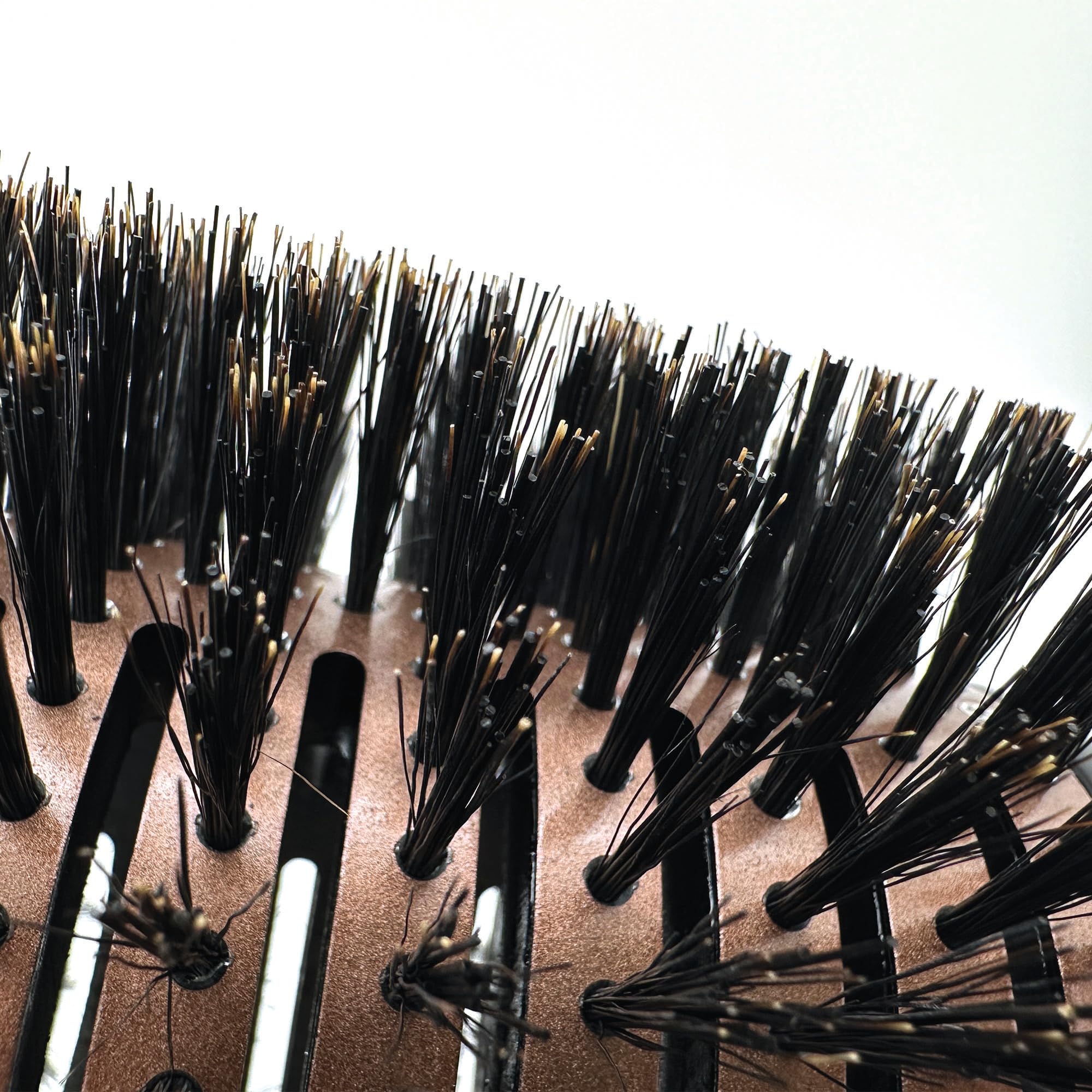 - Mixed Boar and ionic nylon bristle reinforces the bristle’s stiffness and provides strong penetration for thick and coarse hair. Boar bristles contains natural oil which is suitable for repairing cuticles and distributes natural oil evenly from scalp to end of hair, conditions and promotes smooth, healthier hair. The Ionic nylon bristles can sustain heat to 160-180 degrees Celsius under normal use and is considered the best nylon material for professional hair brushes.